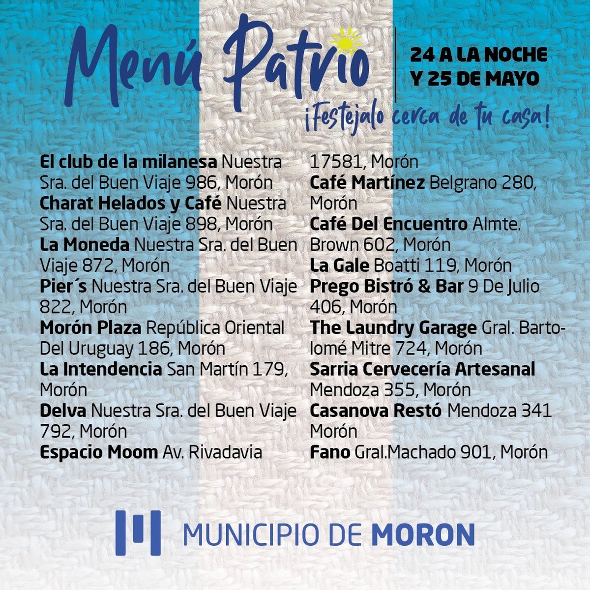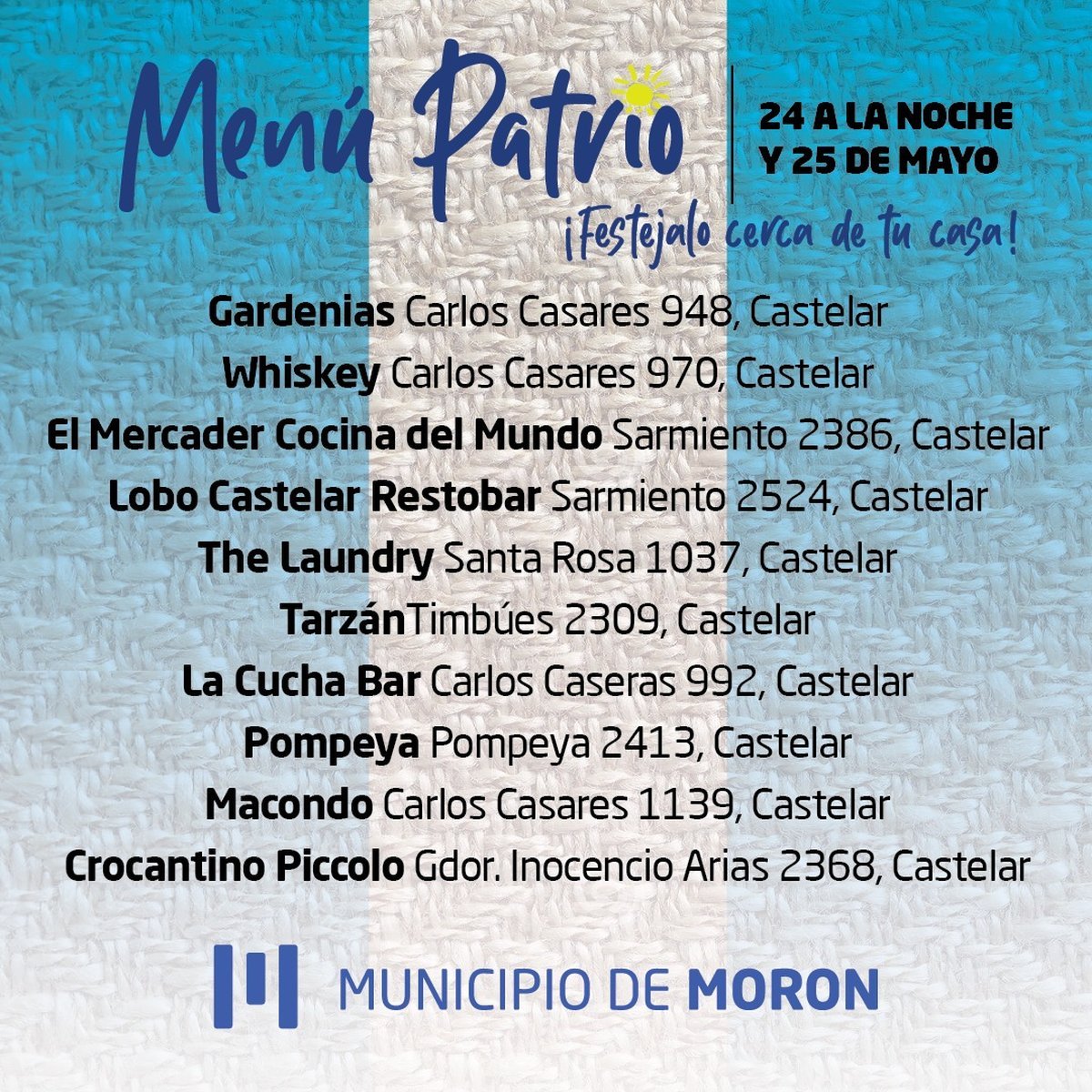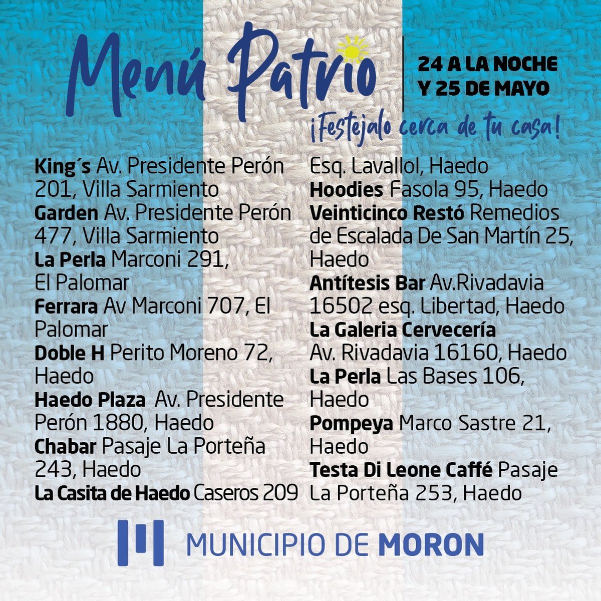 "¿Dónde vas a comer locro patrio? ¡Que sea en Morón! Mirá todos los locales gastronómicos adheridos con ofertas, promociones y descuentos para comer el 24/5 a la noche y durante el miércoles 25 de mayo", anunciaron desde el Municipio en sus redes sociales oficiales.