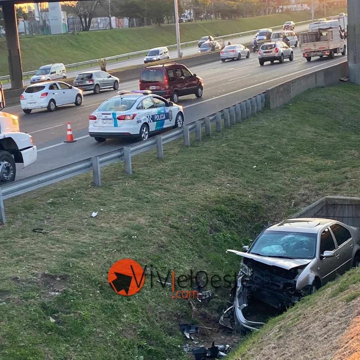 En la mañana de hoy, Viví el Oeste reportó sobre un extraño y bizarro accidente en la colectora norte del Acceso Oeste, a la altura del puente de la calle Capitán Claudio Rosales en El Palomar, donde un Volkswagen Bora de color gris cayó al zanjón que se encuentra entre la autopista y la banquina.
