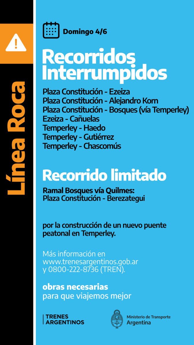 La empresa estatal Trenes Argentinos Operaciones anunció que varios ramales del Tren Roca se van a interrumpir durante este fin de semana debido a una serie de obras, dentro de los cuales se encuentra el que une la localidad de Haedo, al este del partido de Morón, y el Oeste con Temperley y la zona sur.