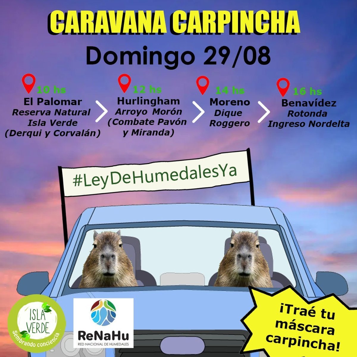 Los vecinos que quieran asistir podrán llevar su máscara de carpinchos para visilbilizar el reclamo y generar más difusión al pedido. Según el cronograma al que accedió Viví el Oeste, a las 10 horas el epicentro de la caravana será El Palomar. A la hora del Mediodía estarán en Combate de Pavón y Miranda, a la vera del Arroyo Morón en Hurlingham, y a las 14 horas en las cercanías del Dique Roggero. La caravana del Oeste llegaría a la rotonda de ingreso a Nordelta cerca de las 16 horas. Quienes no llegue un a asistir, se podrán sumar con una foto y un cartel de apoyo a la Ley de Humedales.