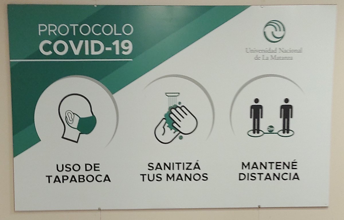 También en varios sectores tanto en las aulas, en los pasillos, en los patios hay diferentes carteles que recuerdan los principios básicos del protocolo como el uso de la mascarilla y el lavado de manos constante. Estos están acompañados por la señalética en los pisos y en los asientos para mantener la distancia de 2 metros.