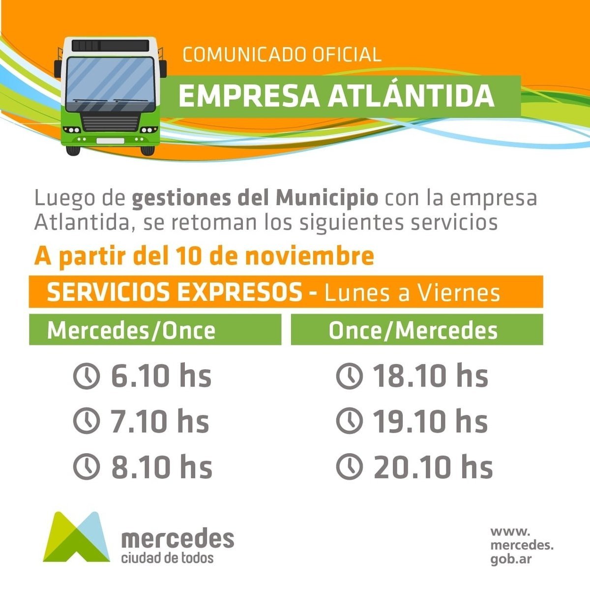 En paralelo, las autoridades locales en Mercedes informaron que, "luego de gestiones del Municipio con la empresa Atlántida", ya se retomaron a partir del 10 de noviembre los servicios expresos.