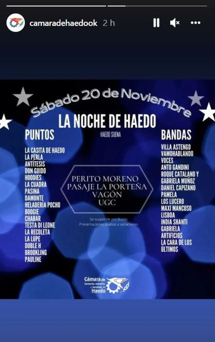 La Cámara de Comercio, Industria y Servicios de Haedo anunció que el próximo sábado 20 de noviembre, por el aniversario número 132 de la localidad y para promover el comercio local, se realizará "La noche de Haedo", en colaboración con la Gestión Comunitaria Nro 2.