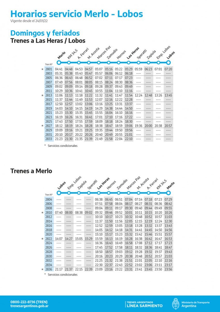 El servicio del Tren Sarmiento desde el 24 de enero comenzará a funcionar entre Merlo y Las Heras. En ese sentido, Trenes Argentinos publicó el nuevo cronograma de horarios. Además, habrá un servicio condicional entre Las Heras y Lobos.