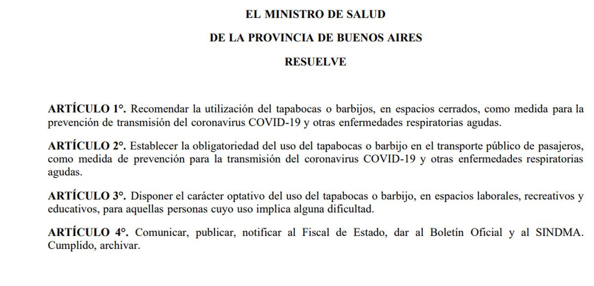 En la resolución a la que tuvo acceso Viví el Oeste Diario, se recomienda entonces "la utilización del tapabocas o barbijos, en espacios cerrados, como medida para la prevención de transmisión del coronavirus COVID-19 y otras enfermedades respiratorias agudas; se establece "la obligatoriedad del uso del tapabocas o barbijo en el transporte público de pasajeros, como medida de prevención para la transmisión del coronavirus COVID-19 y otras enfermedades respiratorias agudas", pero se dispone "el carácter optativo del uso del tapabocas o barbijo, en espacios laborales, recreativos y educativos, para aquellas personas cuyo uso implica alguna dificultad".
