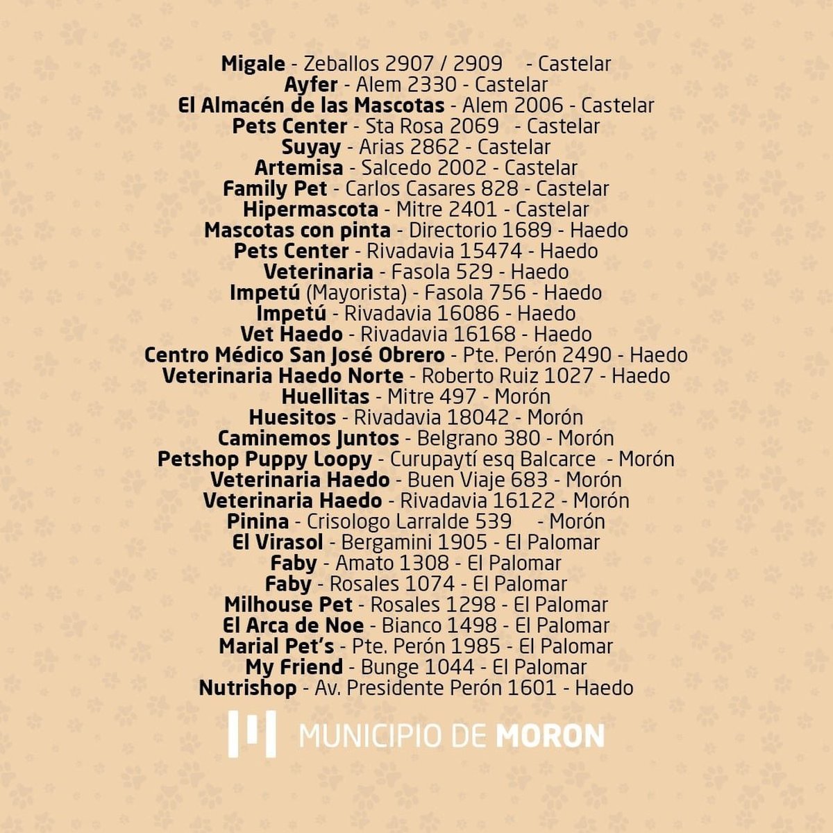 Más de 30 comercios de las localidades de Haedo, Castelar, El Palomar y Morón Centro lanzarán una serie de beneficios y descuentos del 10% para el público general y 15% para los empleados municipales, de acuerdo a lo que informaron desde la comuna en sus redes sociales. Las promociones serán en accesorios y servicios de peluquería para animales.