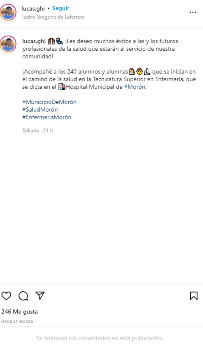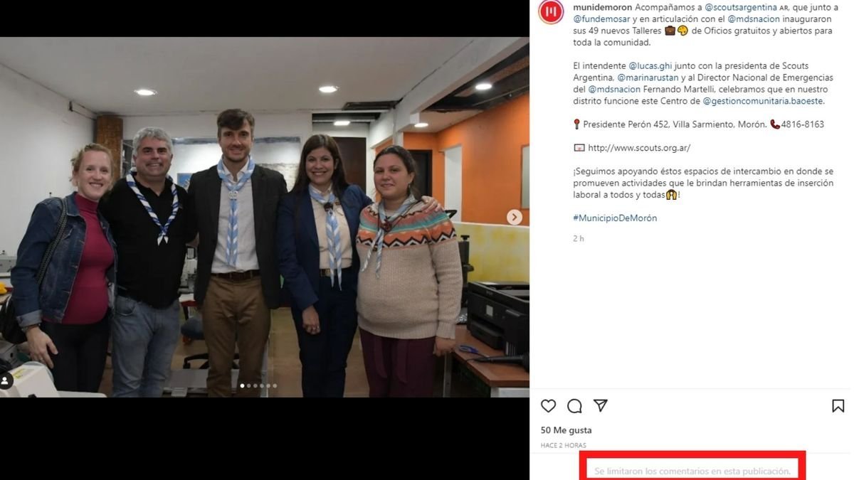 De esta manera, en cada foto o video subido en la red social Instagram por parte de la cuenta oficial de la Comuna, así como también desde el usuario certificado del Ejecutivo Municipal, Lucas Ghi, los internautas no pueden emitir comentarios. Cabe destacar que en Facebook y Twitter, otros perfiles en donde Morón comunica a diario sus novedades, la opción sí está habilitada.