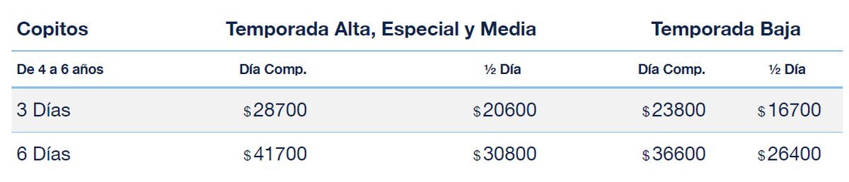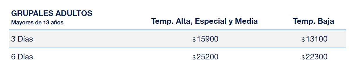 Las clases son para niveles desde principiantes hasta intermedios 4. Menos de 4 personas en una clase se reduce el tiempo a 1 hora con prioridad en los medios de elevación. Las clases grupales tanto de esquí y snowboard están sujetos a disponibilidad y pueden ser modificados. No incluyen equipo. Casco obligatorio hasta los 14 años.