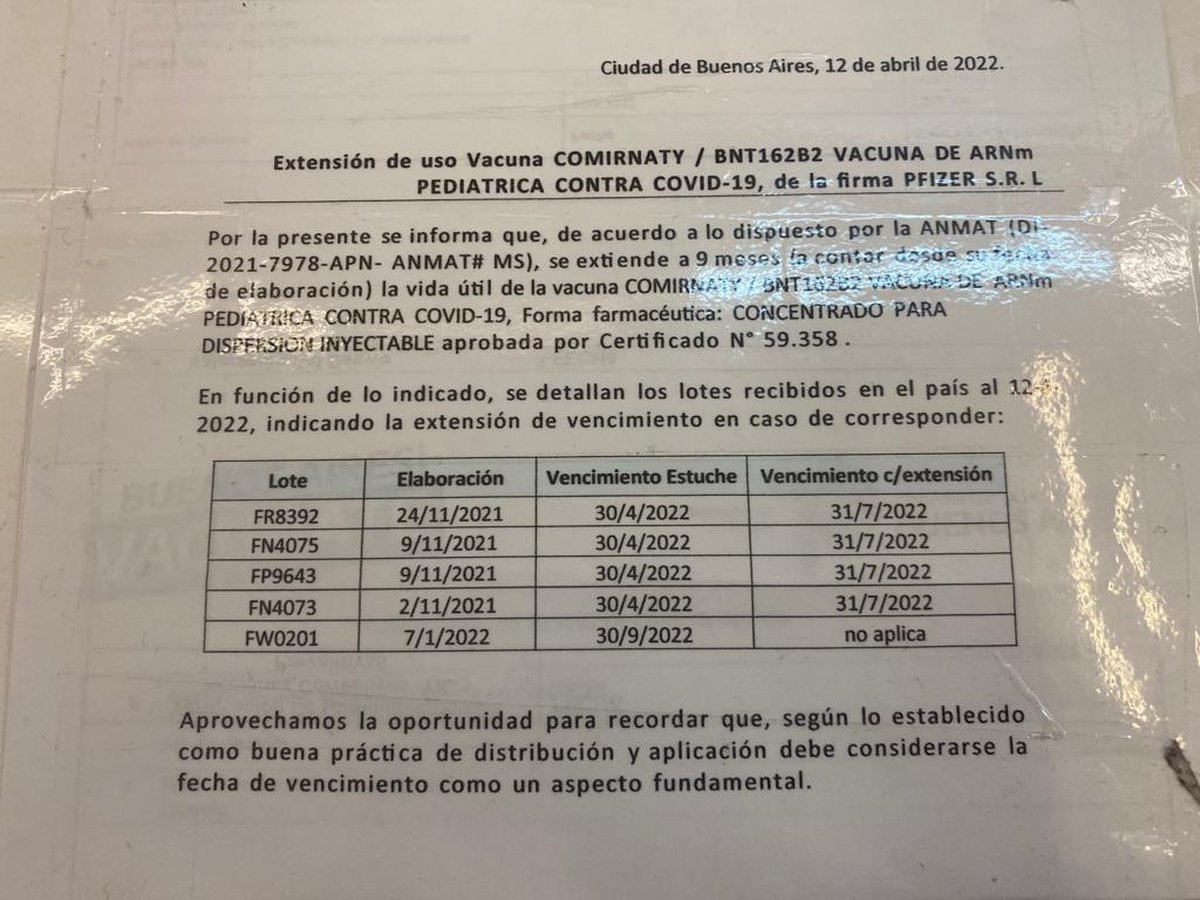 El mencionado documento entregado a los padres en el lugar expresa: "por la presente se informa que, de acuerdo a lo dispuesto por la ANMAT (...), se extiende a 9 meses (a contar desde su fecha de elaboración) la vida útil de la vacuna (...) PEDIÁTRICA CONTRA COVID-19, Forma farmacéutica: concentrado para DISPERSIÓN INYECTABLE aprobada por Certificado N° 59.358".