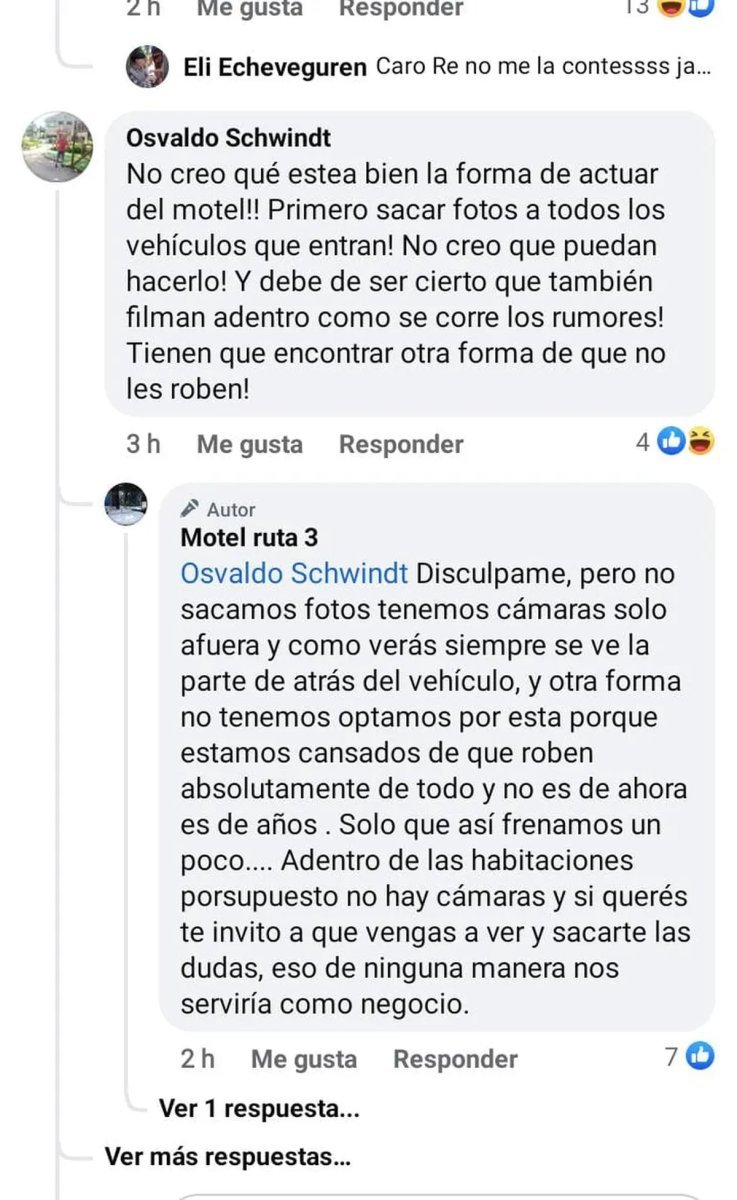A esta respuesta hubo una contraofensiva del motel escrachador, quien sostenía: "Disculpame, pero no sacamos fotos tenemos cámaras solo afuera y como verás siempre se ve la parte de atrás del vehículo, y otra forma no tenemos, optamos por esta porque estamos cansados de que roben absolutamente de todo y no es de ahora, es de años . Solo que así ­ frenamos un poco.... Adentro de las habitaciones por supuesto no hay cámaras y si querés te invito a que vengas a ver y sacarte las dudas, eso de ninguna manera nos serviría como negocio".