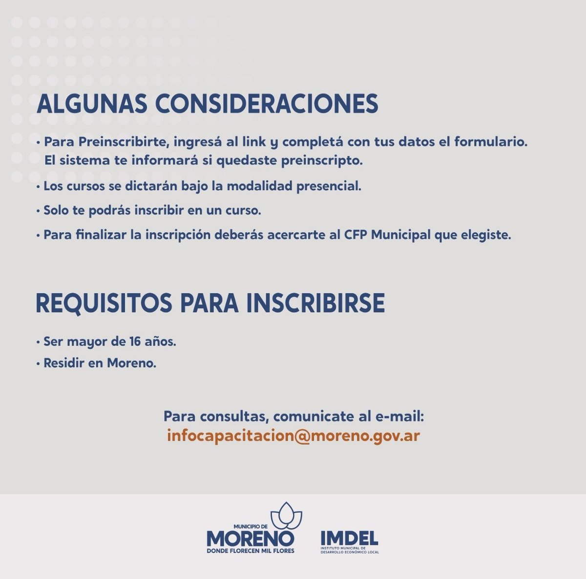 Para preinscribirse, los residentes deben ingresar a este link y completar el formulario virtual, mientras que el sistema avisará a la persona si lo hizo de forma correcta. Los cursos se dictarán bajo la modalidad presencial y los vecinos solo pueden inscribirse en un curso por vez. Los requisitos son ser mayor de 16 años y residir en Moreno.