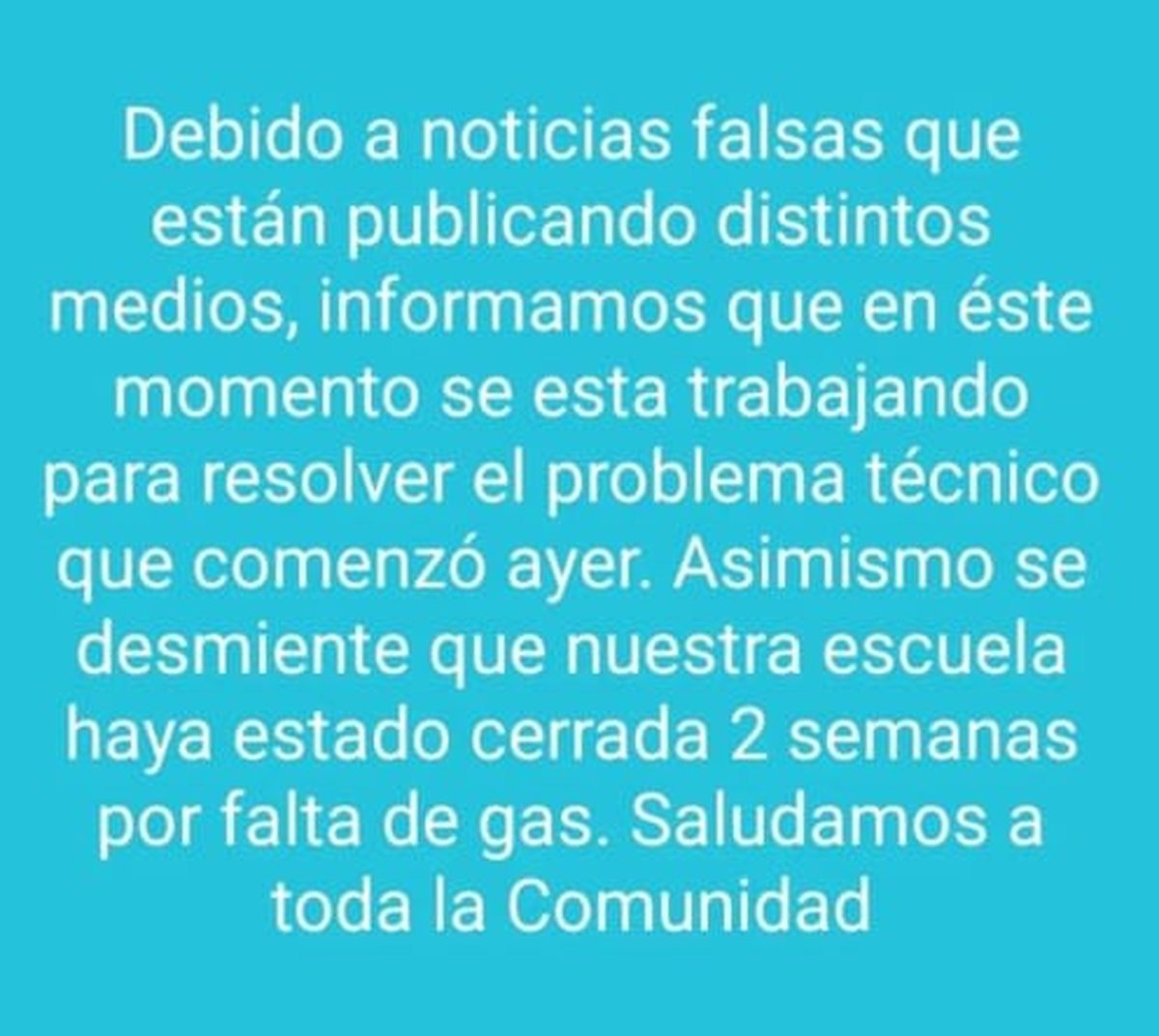 En la tarde de hoy, se había especulado con una suspensión de las clases presenciales en esa escuela de Hurlingham por una falla en la bomba de agua, a la vez que se afirmó que estuvieron unos 15 días con el establecimiento cerrado gracias a la falta de estufas y los desbordes cloacales, pero esta idea fue desmentida por los directivos a través de su cuenta oficial de Facebook.