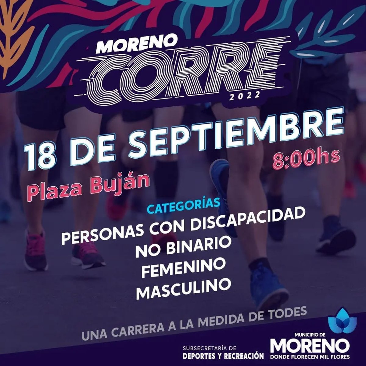 El Municipio de Moreno anunció en las últimas horas la apertura de las inscripciones gratuitas para sus tres carreras anuales, las cuales se desarrollarán el próximo domingo, 18 de septiembre, desde la Plaza Buján (ubicada en la calle Justo Daract al 1.541, a dos cuadras de las vías del Tren Sarmiento) a las 8 de la mañana.