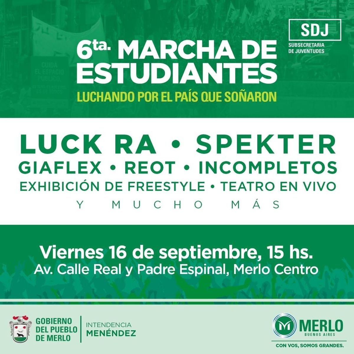 De la 6° Marcha de Estudiantes, Luchando por el país que soñaron, tocarán Spekter, Giaflex, Reot, Incompletos y el cierre estará a cargo de Luck Ra. Además, habrá exhibición de freestyle, teatro en vivo, feria, y más.