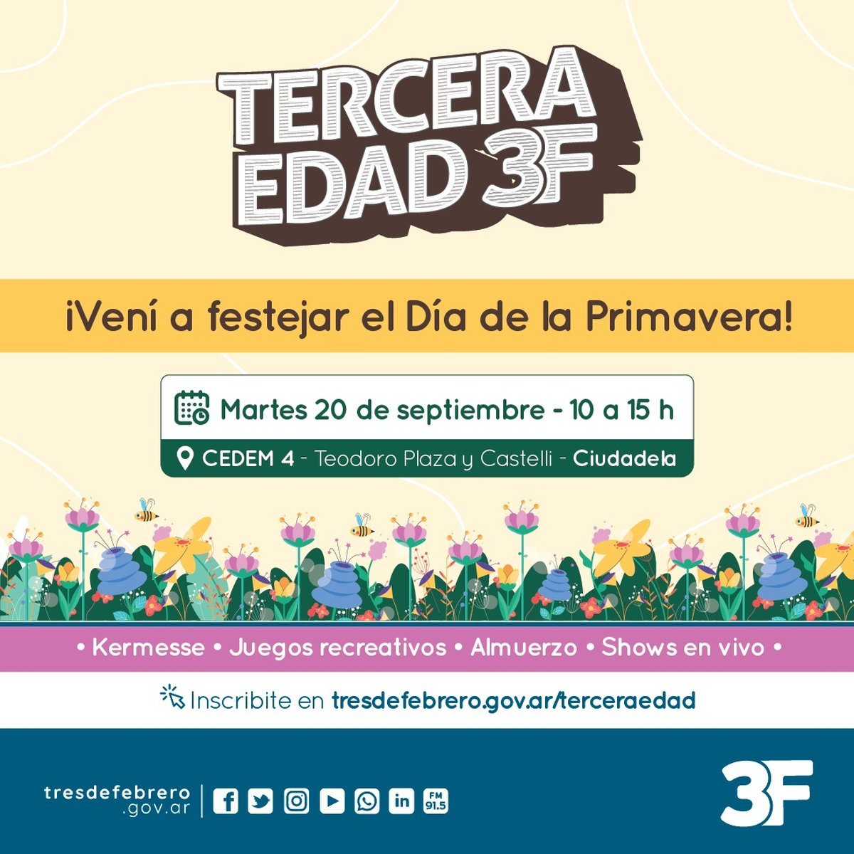 Este martes 20 de septiembre, a partir de las 10 hasta las 15 horas, se llevará a cabo un festival denominado "Tercera Edad 3F" en el marco del Día de la Primavera. El mismo estará destinado a los adultos mayores vecinos del distrito y tendrá lugar en el CEDEM 4 de Ciudadela, Partido de Tres de Febrero, zona oeste del conurbano bonaerense.