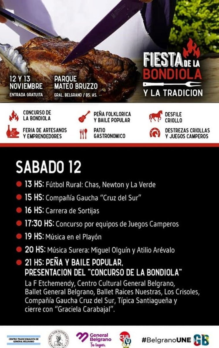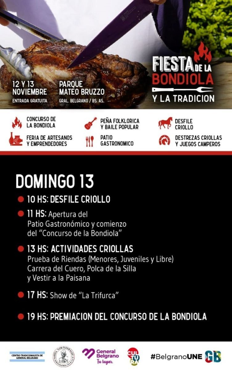 Este sábado 12 y domingo 13 de noviembre, se llevará a cabo la Fiesta de la Bondiola y la Tradición en la localidad bonaerense de General Belgrano. Se trata de la fiesta popular que reúne música, danza, gastronomía y costumbres campestres, una propuesta para disfrutar y compartir los distintos saberes gastronómicos en torno a la bondiola. La misma tendrá lugar en el Parque Mateo Bruzzo, situado a orillas del Río Salado (General Belgrano), con entrada libre y gratuita.