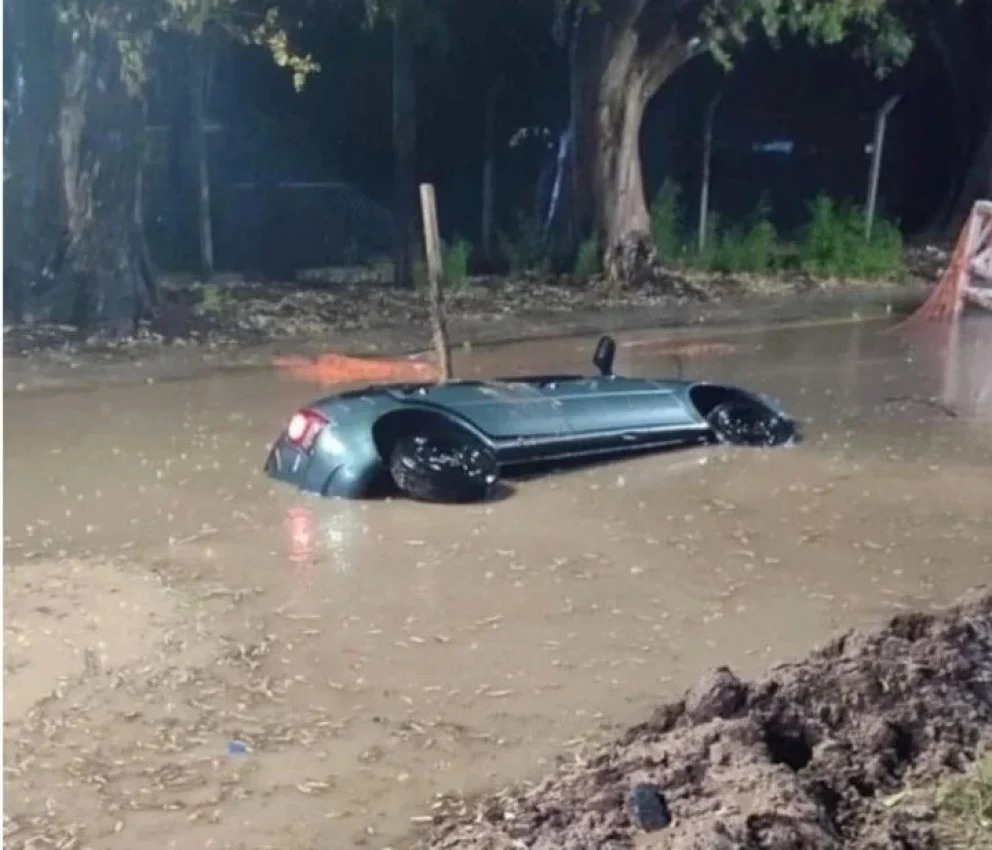Diluviaba y una familia cayó con el auto en un pozo, la calle se encuentra en obras y debió al temporal se lleno de agua. La palabra del Municipio.
