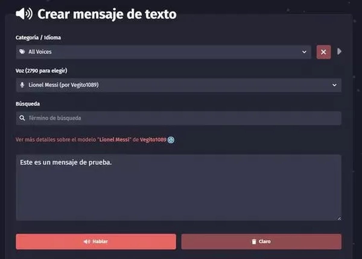 La herramienta es FakeYou, un sitio web que da una oportunidad a los usuarios de poder expresarse con la voz de sus ídolos o personajes más destacados. La plataforma no requiere ser descargada. De igual modo, funciona en cualquier dispositivo que tenga acceso a internet. Permite crear audios como Lionel Messi, Bob Esponja, el Chavo del Ocho, Darth Vader, el maestro Yoda, Piccolo de Dragon Ball, Mariano Closs, entre otros tantos más.