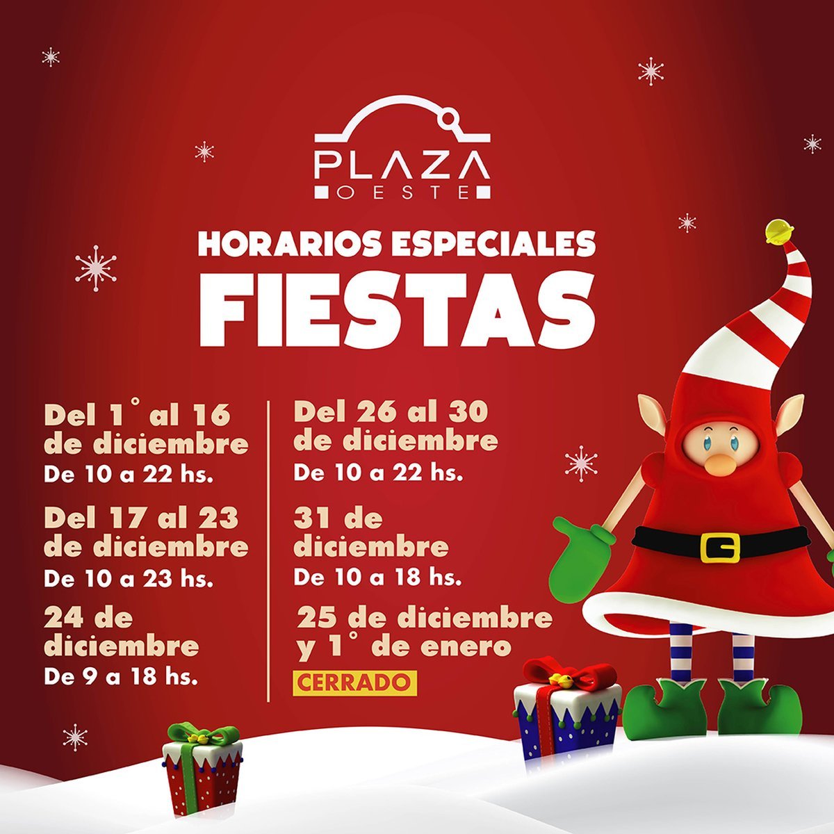 El Plaza Oeste Shopping, ubicado en Av. Brig. Gral. Juan Manuel de Rosas 658, sobre la Colectora Acceso Oeste (Morón) anunció que del 1° al 16 de diciembre, permanecerá abierto de 10 a 2 horas. Del sábado 17 al viernes 23, abrirá desde las 10 y su horario se extenderá hasta las 23 horas. Y el sábado 24 tendrá un horario más temprano, de 9 a 18 horas.