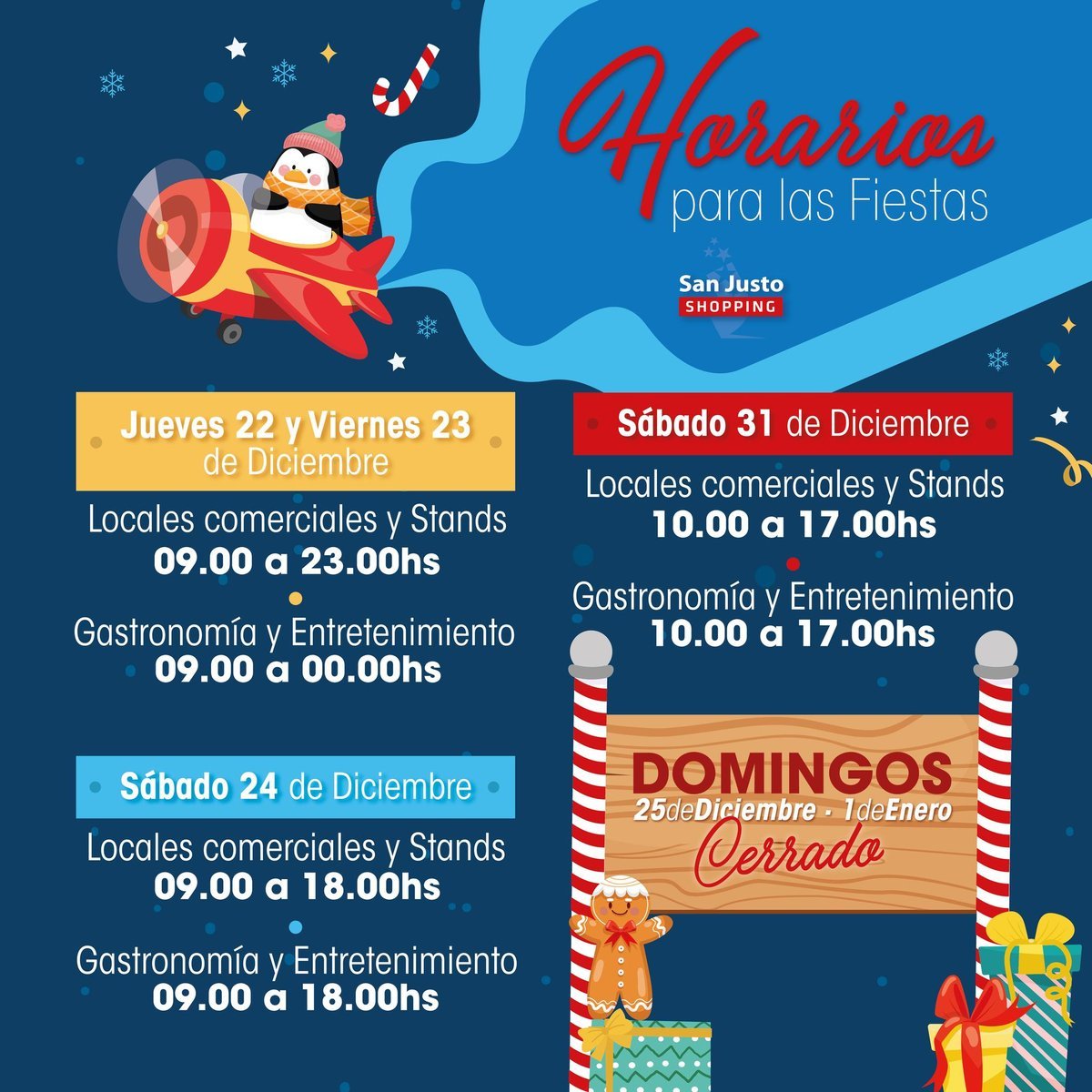 Por otro lado, el San Justo Shopping, situado en Av. Brig. Gral. Juan Manuel de Rosas 3910 (La Matanza), informó que el jueves 22 y viernes 23 de diciembre, los locales comerciales y stands estarán abiertos de 9 a 23 horas, y los locales de gastronomía y entretenimiento de 9 a 00 horas. El sábado 24 de diciembre, todo el shopping abrirá de 9 a 18 horas.