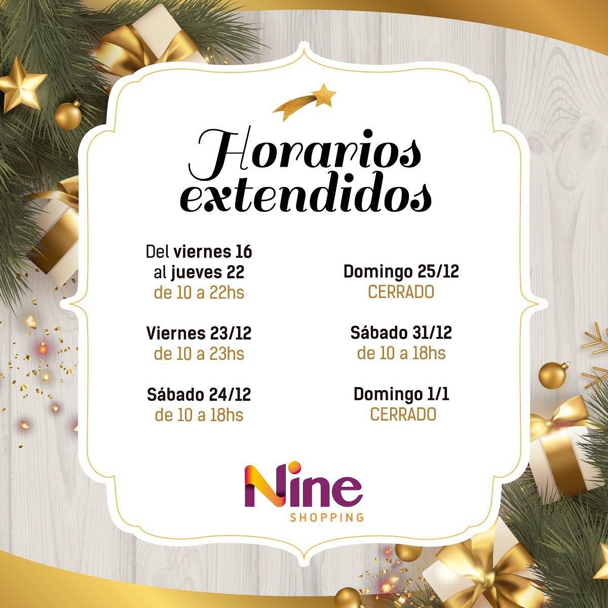 Por último, el Nine Shopping, ubicado en Av. Victorica 1128 (Moreno), anunció que extenderá sus horarios en diciembre: Del viernes 16 a jueves 22 estará abierto de 10 a 22 horas; el viernes de 10 a 23 horas; el sábado 24 y el sábado 31 de 10 a 18 horas. Mientras que el domingo 25 y el domingo 1° de enero permanecerá cerrado.