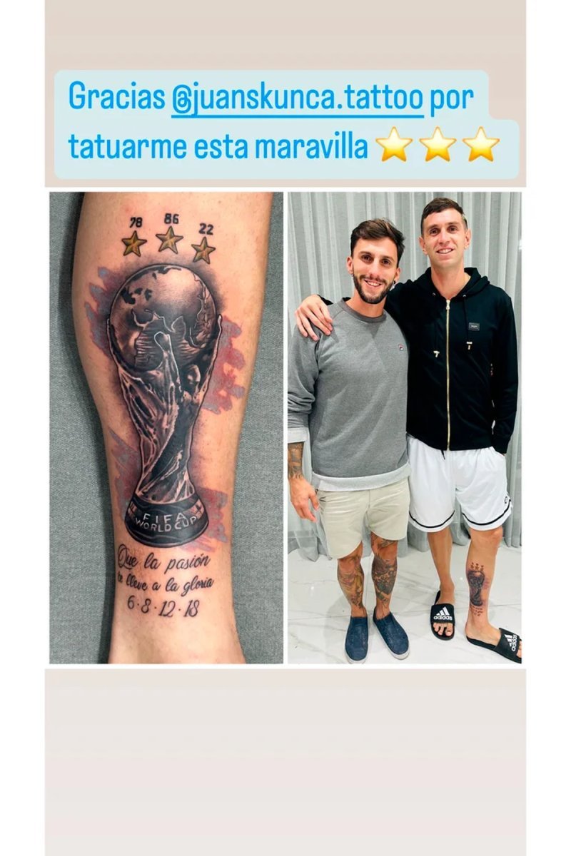Fue él quien se encargó de subir en sus redes sociales el dibujo que se realizó en la piel, en la que se aprecia también una frase que dice: "Que la pasión te lleve a la gloria". Por encima está la Copa del Mundo, que tiene las tres estrellas con los respectivos años de las veces que se ganó por Argentina. "6, 8, 12 y 18", añadió también en su pierna izquierda. Como era de esperarse, fue viral de inmediato.
