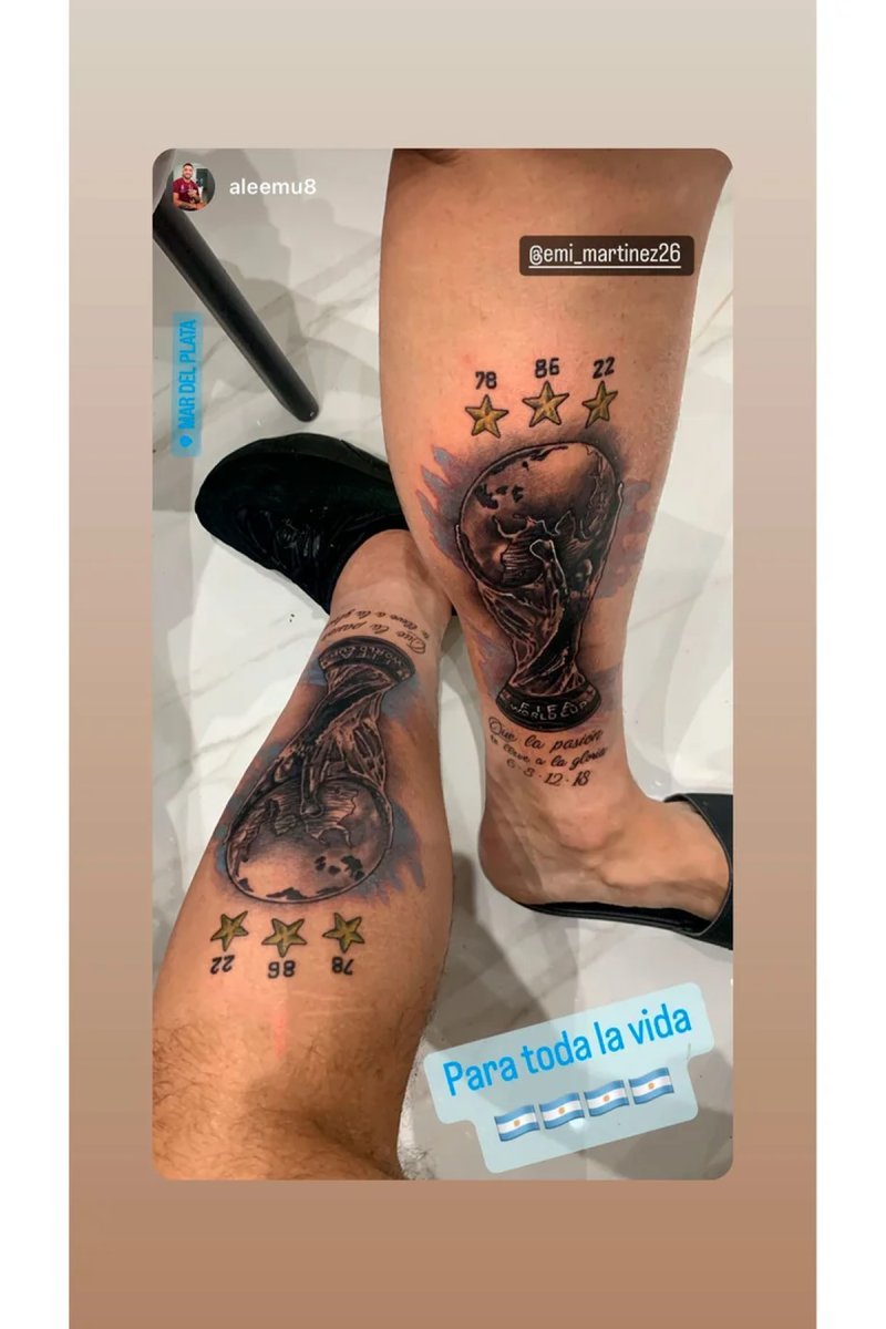 Luego de haber sido homenajeado ante unas 150 mil personas en el Arena Fest, situado en el paseo Hermitage, Las Toscas, en el centro de La Feliz, el arquero cumplió su promesa. Levantar el trofeo más preciado por todos los futbolistas fue un sueño hecho realidad, por lo que ahora decidió no olvidarse jamás de ello e inmortalizarlo en su piel Emiliano se realizó un impactante tatuaje con la Copa del Mundo en una de sus piernas.