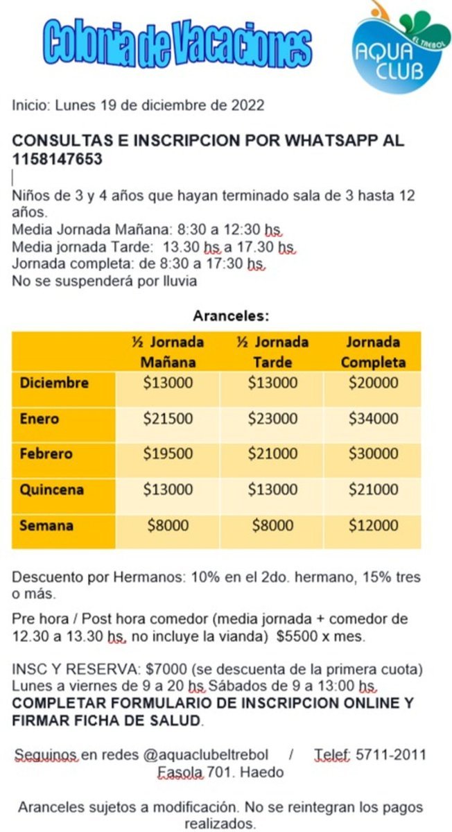 Los aranceles para enero son: media jornada por día $3.300, 1 semana $12.900, 2 semanas $17.800, 3 semanas $23.700 y 4 semanas $28.800. Jornada completa por día $4.400, 1 semana $18.550, 2 semanas $29.300, 3 semanas $40.300 y 4 semanas $49.600.
