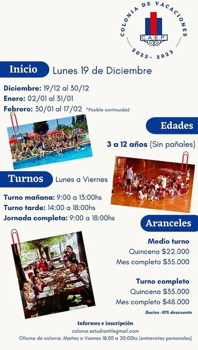 Aranceles para las colonias de verano Club Brisas.
