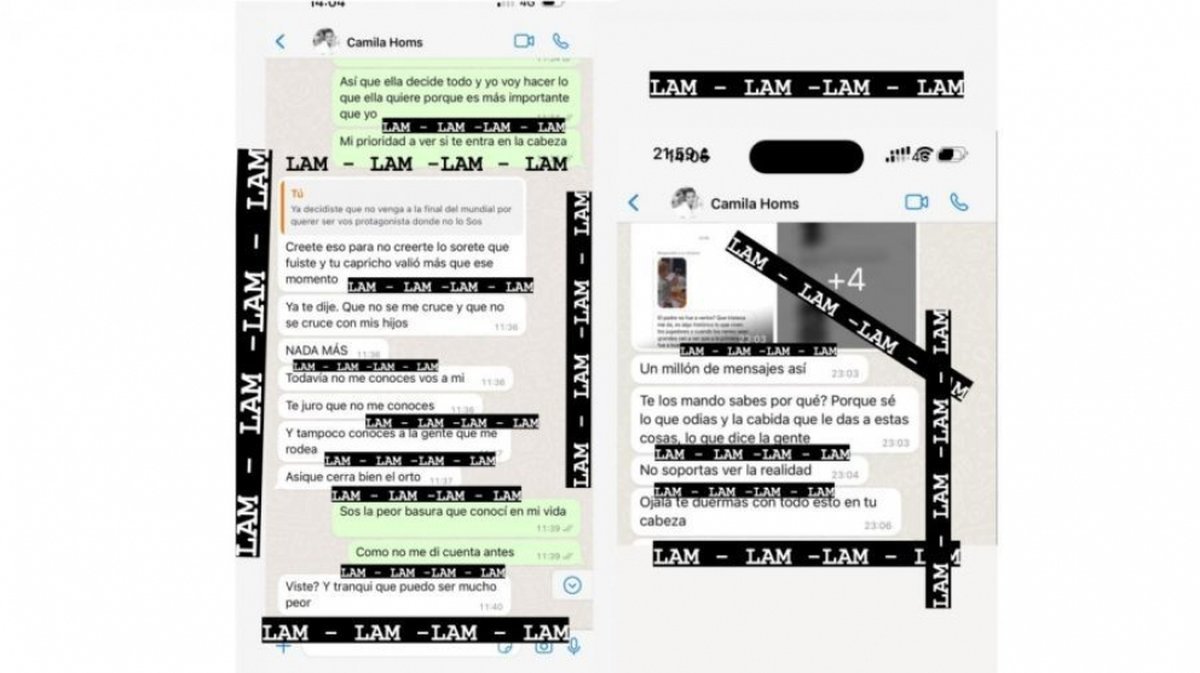 Además de las imágenes que se viralizaron, hubo más mensajes fuertes a Tini y De Paul por parte de Camila Homs. "Mereces lo peor vos y la *** de tu novia que se volteó a medio mundo. No te pienso cruzar así que no sé cómo harás para ver a tus hijos. Me voy a encargar de que el mundo entero te conozca por lo mierd* que sos más que por ser campeón del mundo", leyó Ángel.