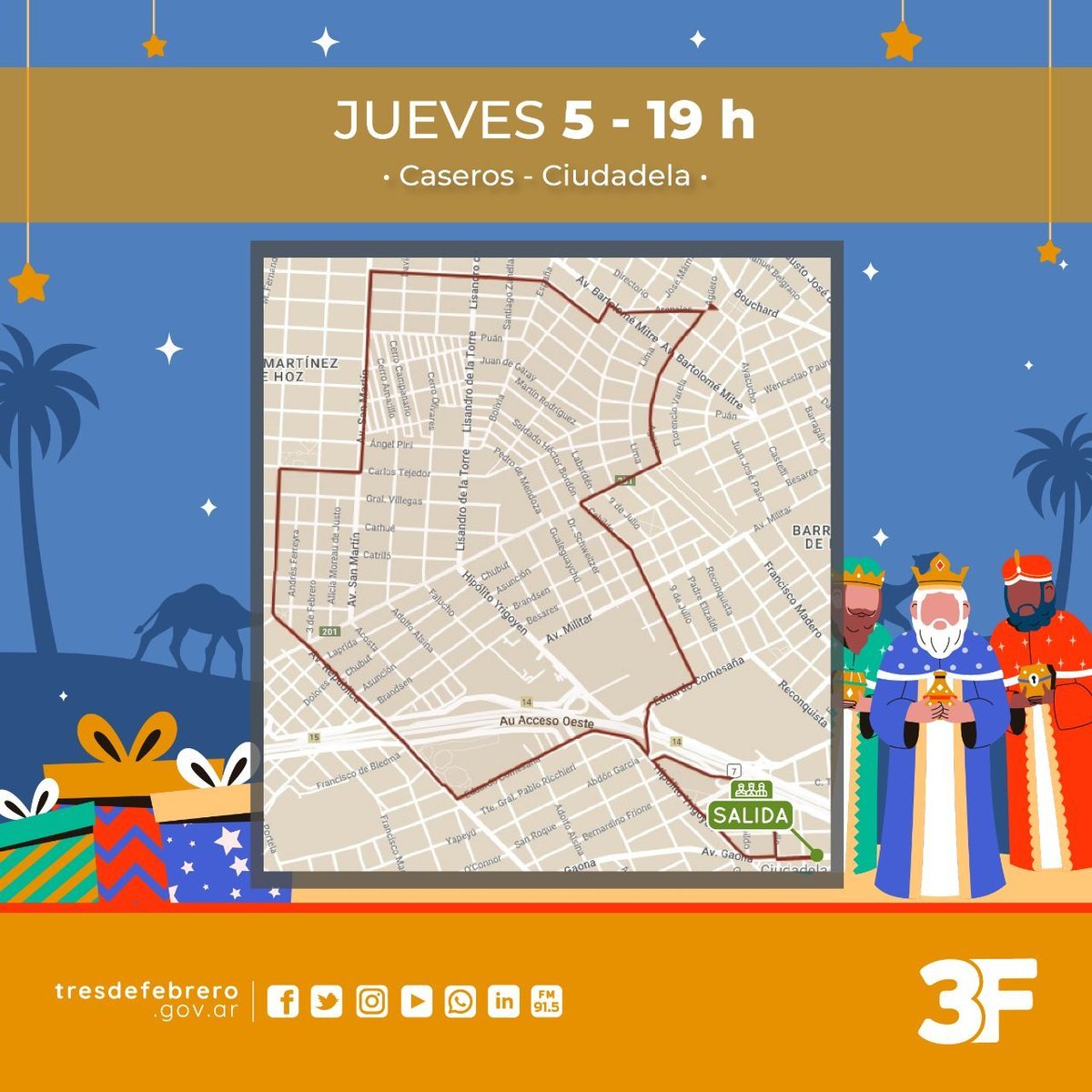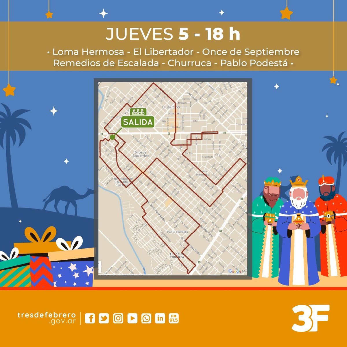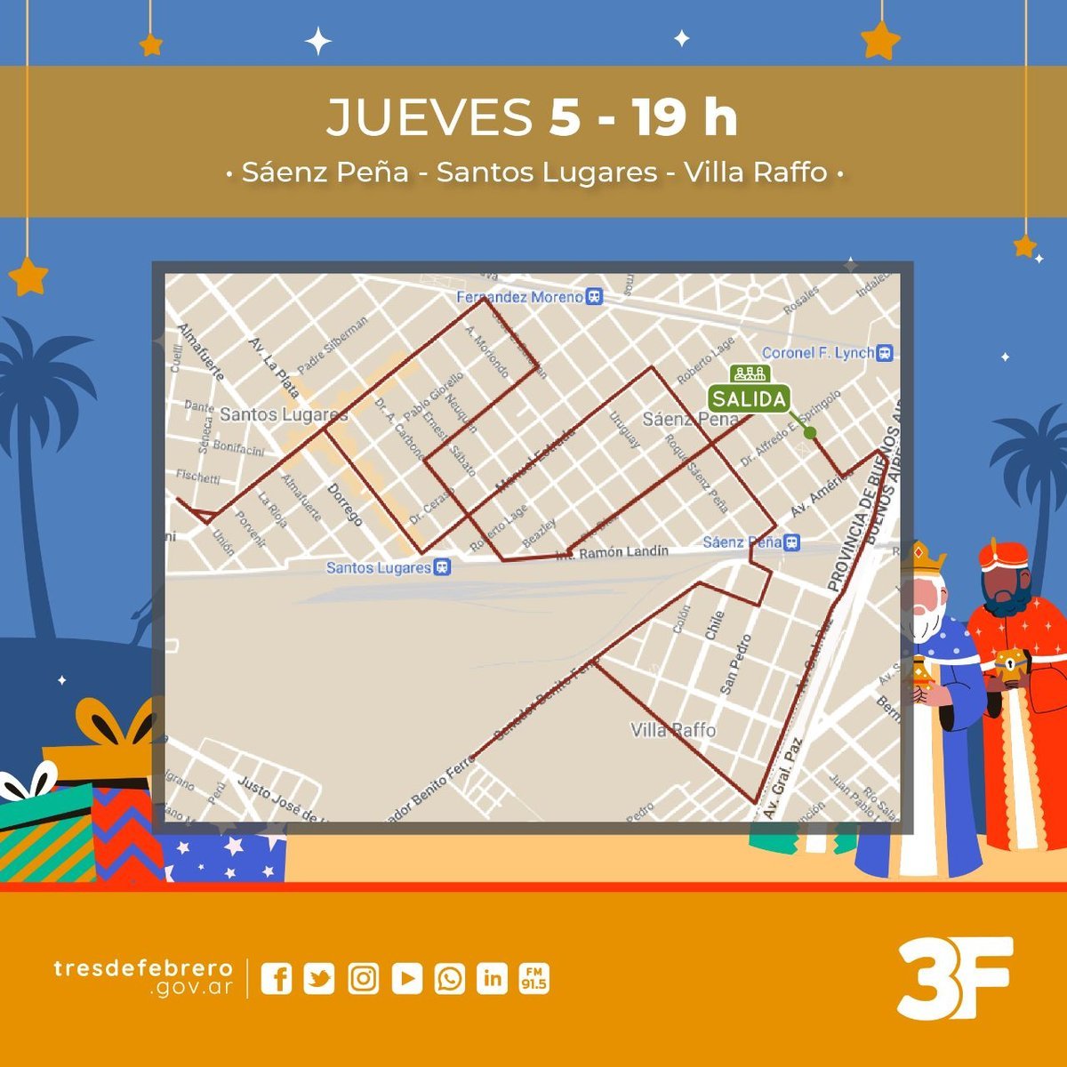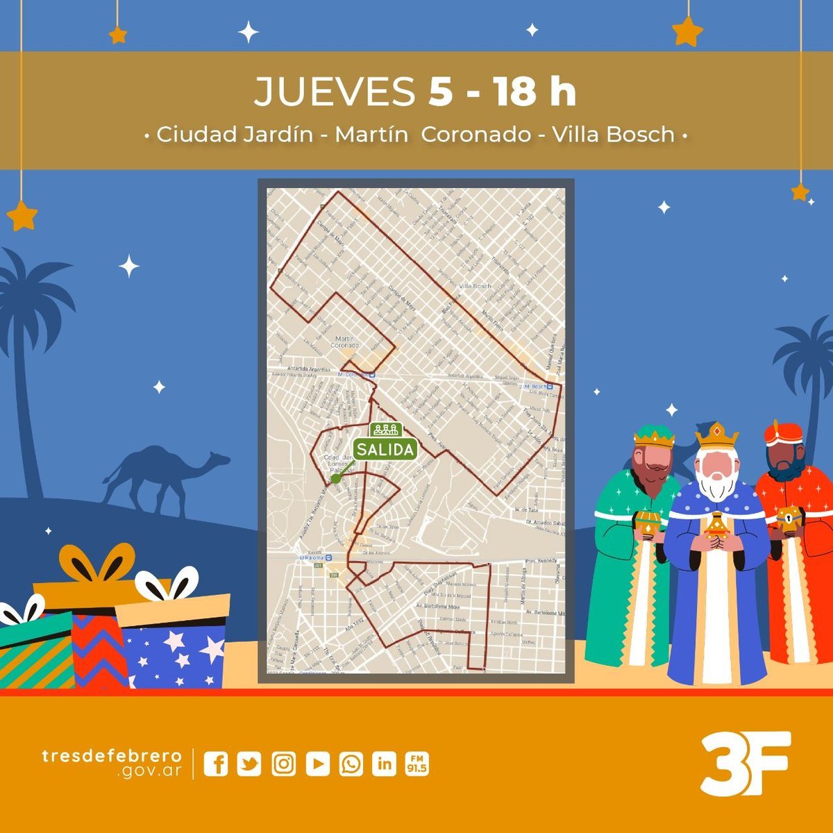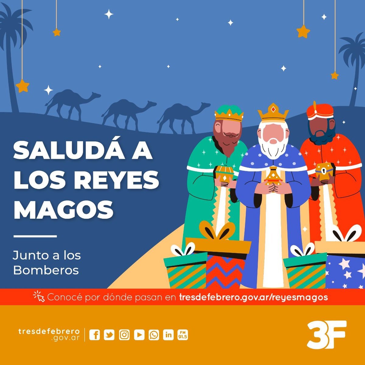Como cada año para estas fechas, el partido de Tres de Febrero contará con la presencia de los Reyes Magos, quienes visitarán y recorrerán las diferentes localidades que componen el distrito junto a los Bomberos Voluntarios para celebrar, con anticipación, el Día de Reyes.