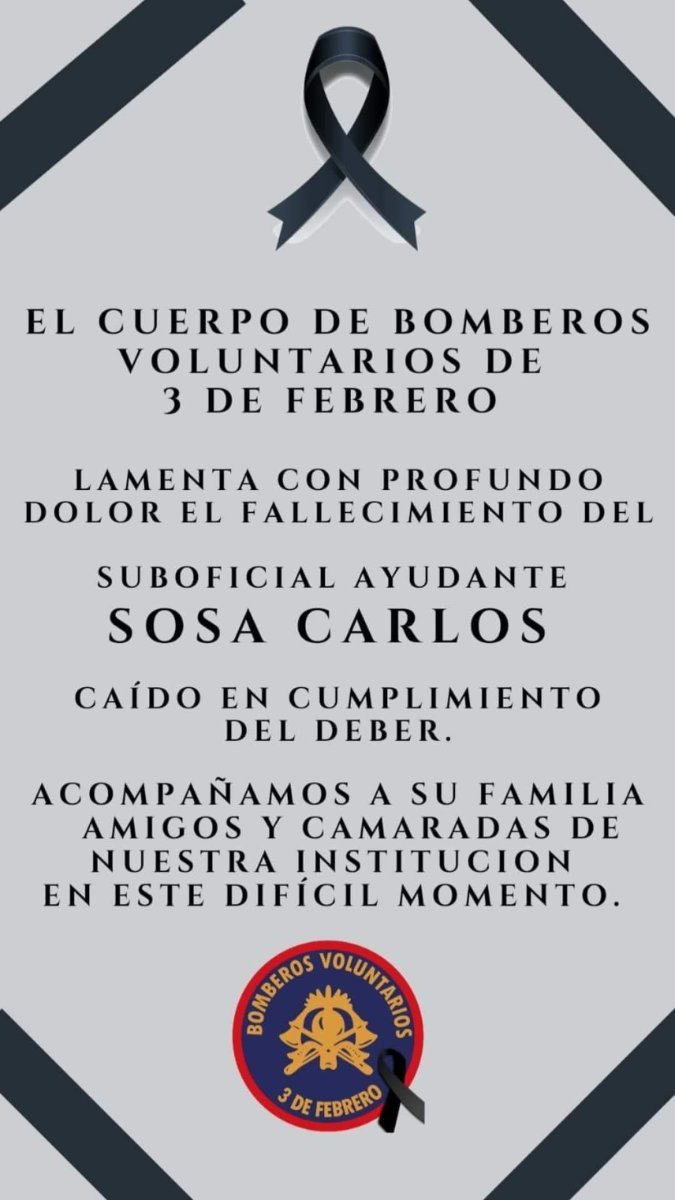 El dolor y la conmoción se apoderó de todo el partido de Tres de Febrero cuando se conoció la noticia de que Carlos Alberto Sosa (L.P. 85/0572), un bombero del Destacamento número 3 de Loma Hermosa, murió mientras se dirigía a cubrir una llamada de incendio producto de un accidente con su moto.