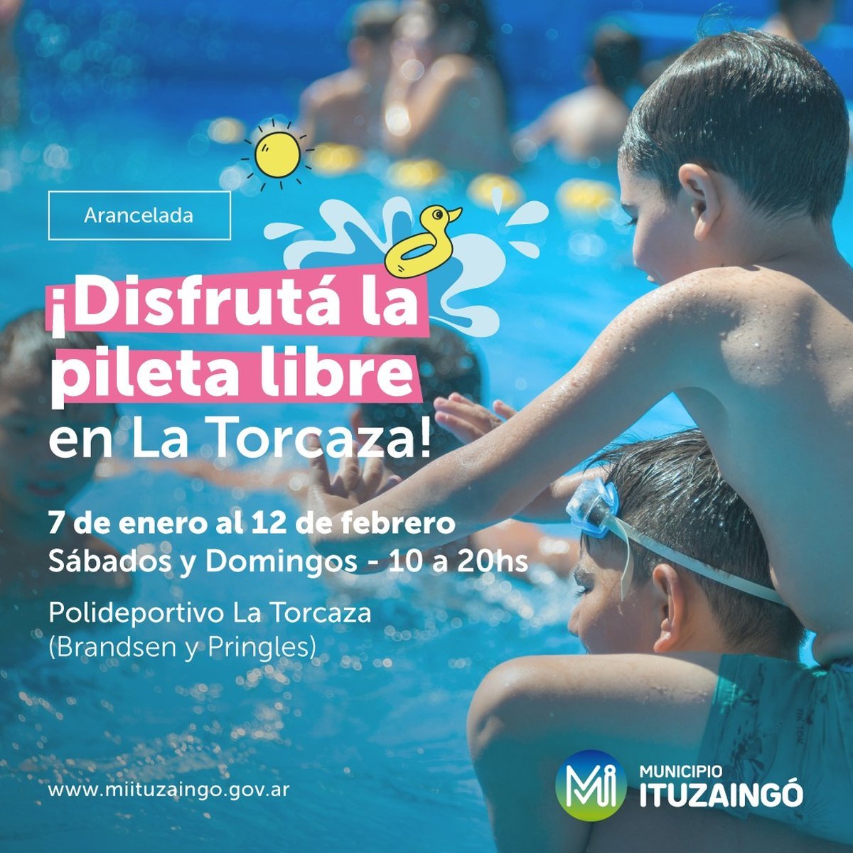 La pileta se encuentra habilitada los sábados y domingos, de 10 a 20 horas, la cual es arancelada y abierta a toda la comunidad. Los valores vigentes son: Menores a partir de 6 años con domicilio en Ituzaingó $580; y menores a partir de 6 años con domicilio en otro distrito $760. En cuanto a los adultos a partir de 18 años con domicilio en Ituzaingó $900; y adultos a partir de 18 años con domicilio en otro distrito $1300. Cabe destacar que los menores hasta 5 años, jubilados, y personas con discapacidad (presentando el carnet) ingresan gratis.