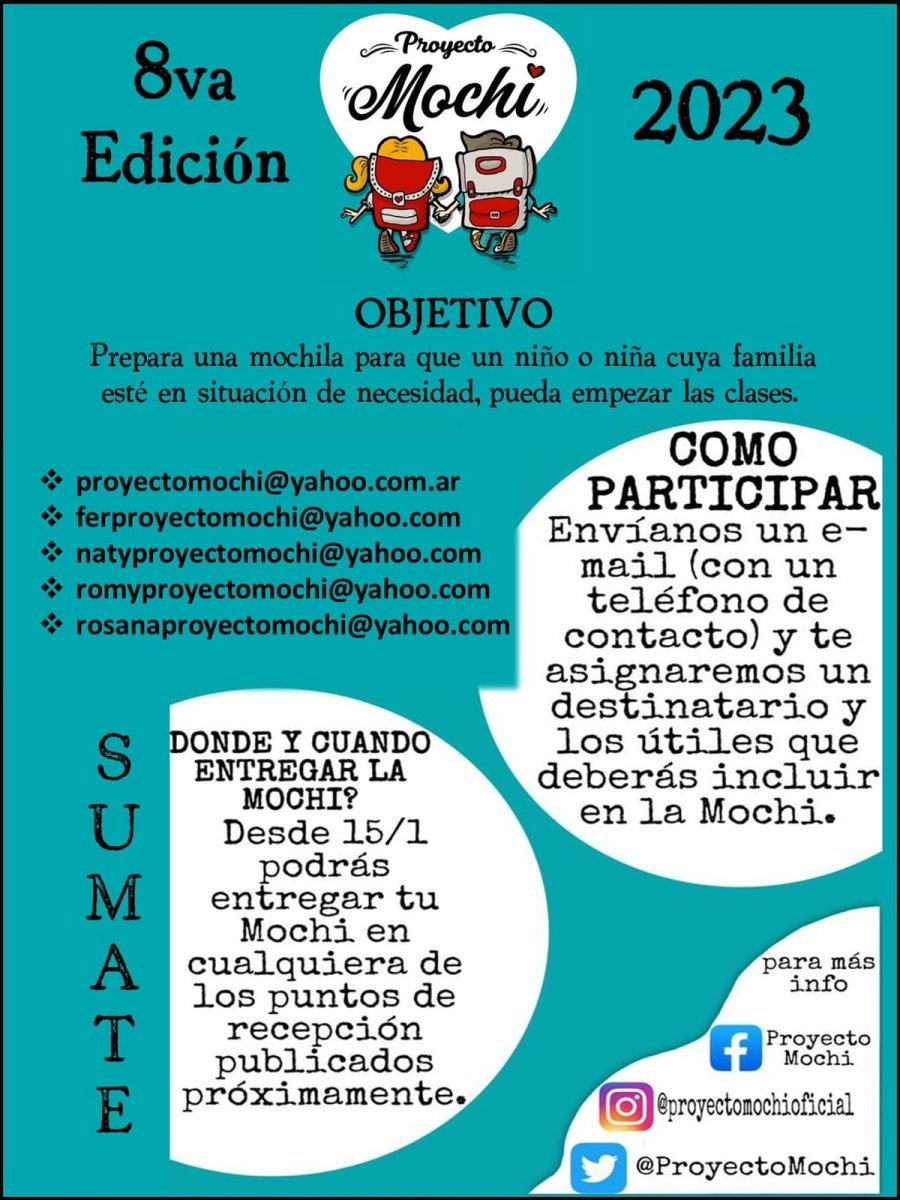 Como cada año, a pocas semanas del comienzo de clases, la asociación solidaria Proyecto Mochi impulsa su campaña N°8 "de una mochila para los niños", en la cual colectan mochilas con útiles escolares para donar. Esta iniciativa tiene como objetivo que los niños cuya familia esté en situación de necesidad, pueda empezar las clases.