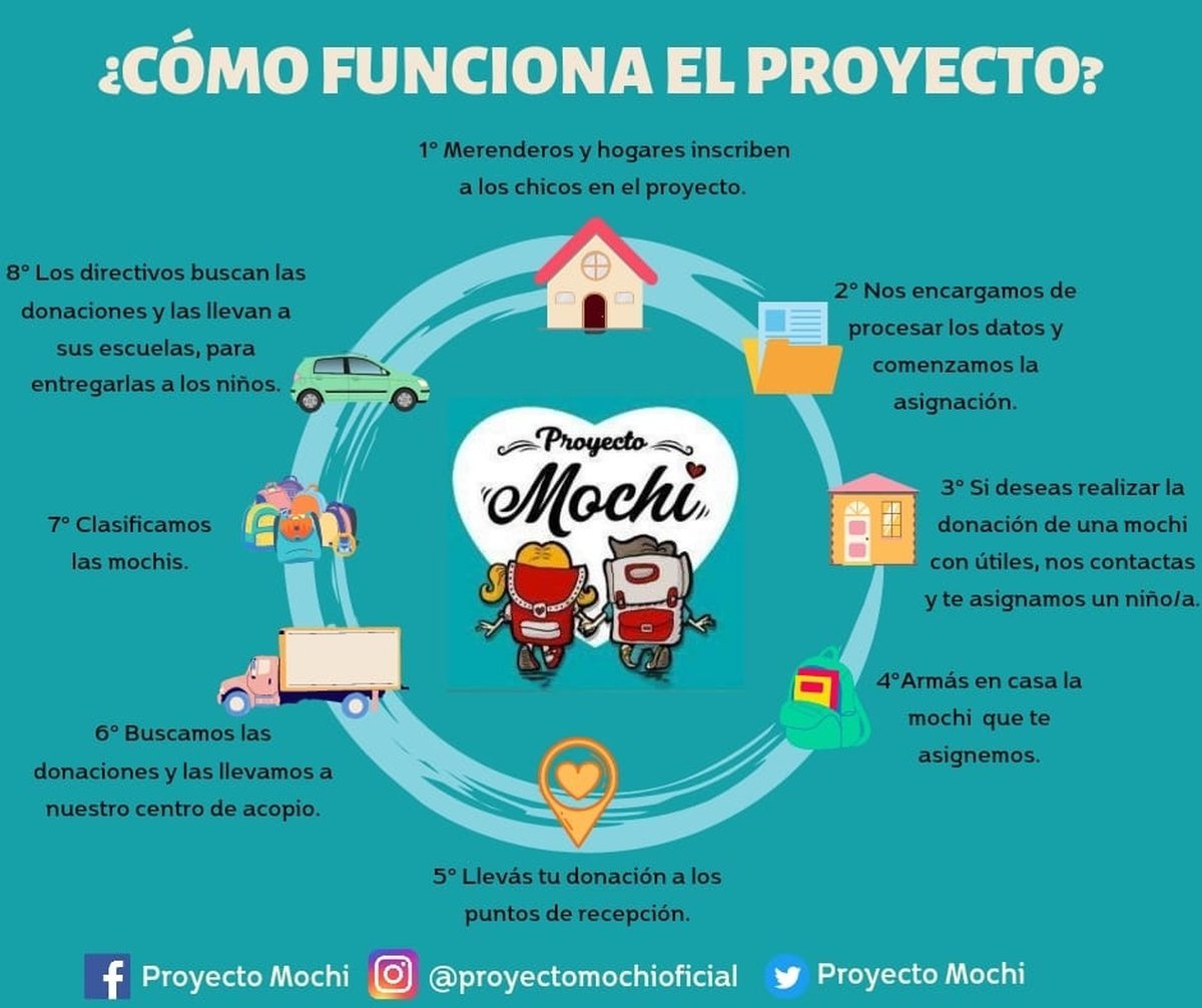 En primer lugar, diferentes merenderos y hogares inscriben a los chicos en el proyecto para que reciban una mochila. En segundo lugar, los miembros de la campaña, se encargan de procesar los datos, y luego, Proyecto Mochi asignará un destinatario y los útiles que deberá incluir en la mochila, a quien desee realizar la donación de una mochila con útiles.