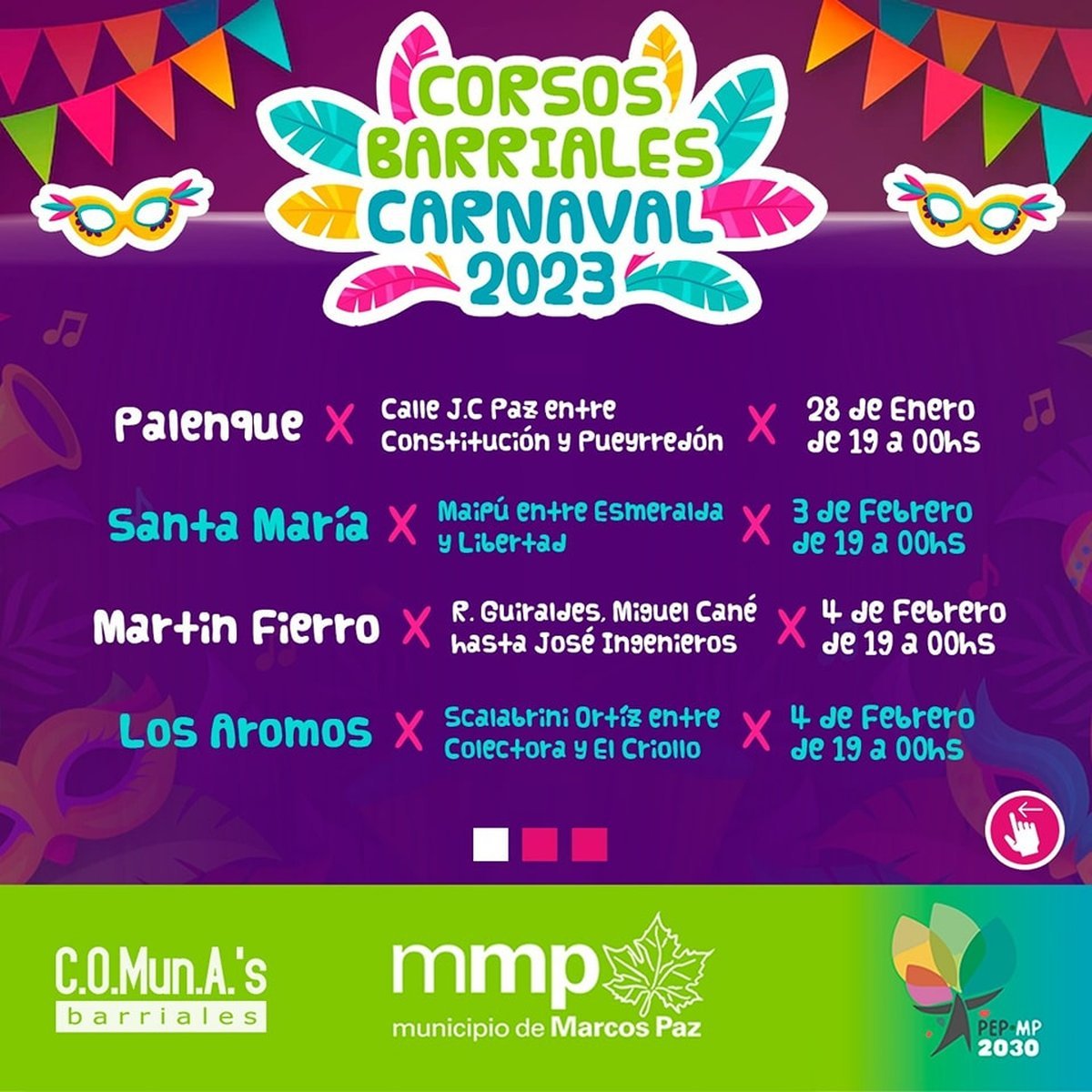 Las calles de diferentes barrios de Marcos Paz estarán colmadas de alegría, música y baile en vivo, espuma, y diversión para el disfrute de quienes asistan. Los carnavales están organizados por la Dirección de Comunas y la Unión de Murgas de Marcos Paz, y la Subsecretaría de Cultura.