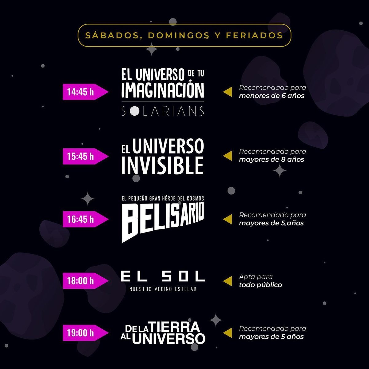 - A las 19 horas: "De la Tierra al universo", un espectáculo en el que se realiza un viaje desde el planeta hacia las maravillas que oculta el cielo estrellado. Recomendado para mayores de 5 años.