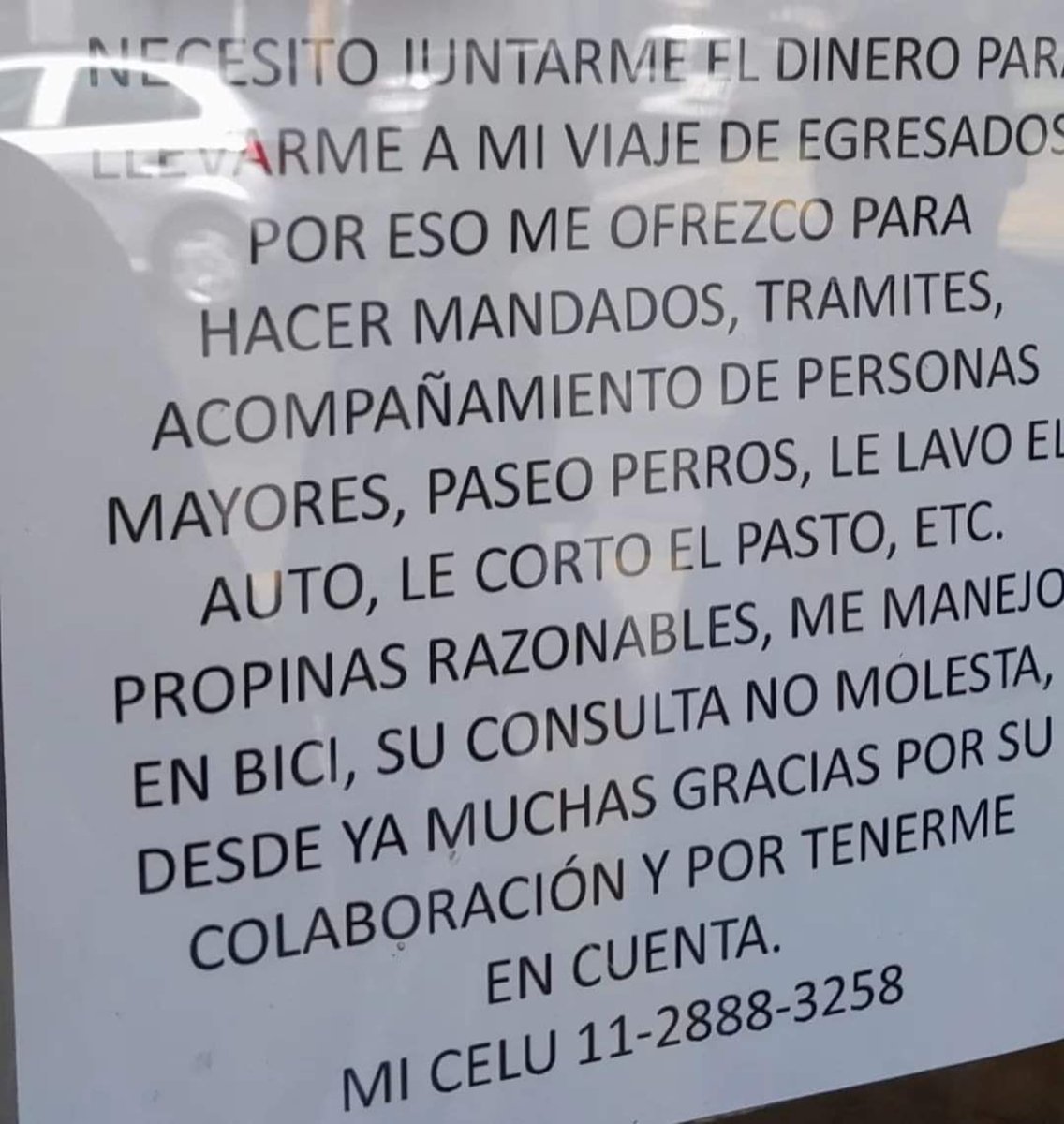 Allí, el chico se postula para cortar el pasto, pasear perros, hacer mandados o trámites, ayudar a personas mayores, lavar autos y otras tareas con propinas razonables, sumado a aclarar que se maneja en bicicleta: "Desde ya, muchas gracias por su colaboración y tenerme en cuenta. Mi número de celular es 11-2888-32-58".