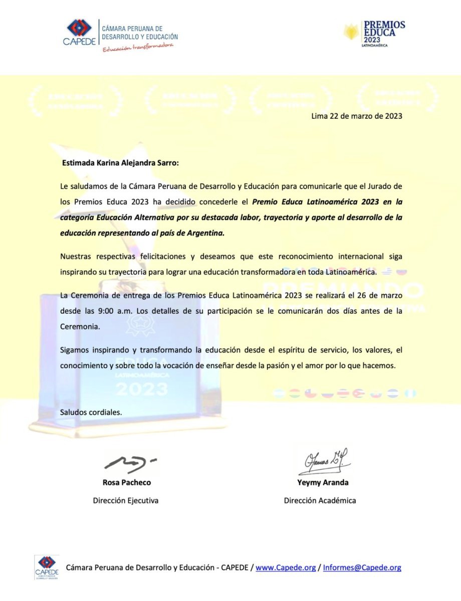 Se trata de Karina Alejandra Sarro, Licenciada en Comunicación Social con título de la mencionada casa de altos estudios y que fue galardonada en la categoría "Educación Alternativa" de los Premios "Educa Latinoamérica 2023", organizados por la Cámara Peruana de Desarrollo y Educación y que condecoran a profesionales de toda Sudamérica, Centroamérica y el Mar Caribe.