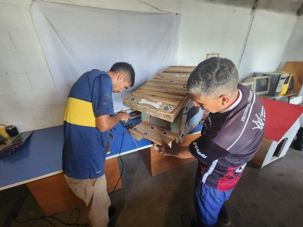 Los 19 reclusos que participaron son de los pabellones 6 y 7, quienes se capacitan y trabajan en carpintería y cortaron, lijaron, encolaron y clavaron las maderas que se consiguieron gracias a la contribución de familiares y guardiacárceles, y confeccionaron las casitas en el predio que actualmente aloja a 72 perros, tanto adultos como cachorros.