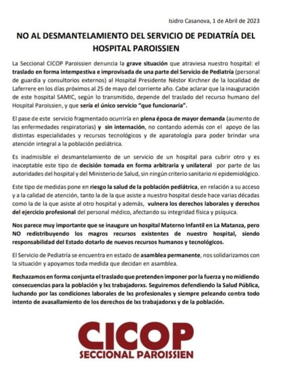 Es por eso que tildaron de carecer de "criterio sanitario y epidemiológico alguno" al Ministerio de Salud de la Nación y los mandamases del Paroissien: "Es inadmisible el desmantelamiento de un servicio de un hospital para cubrir a otro y es inaceptable este tipo de decisión tomada de forma arbitraria y unilateral, que solo pone en riesgo a los pacientes y vulnera los derechos laborales y del ejercicio profesional".