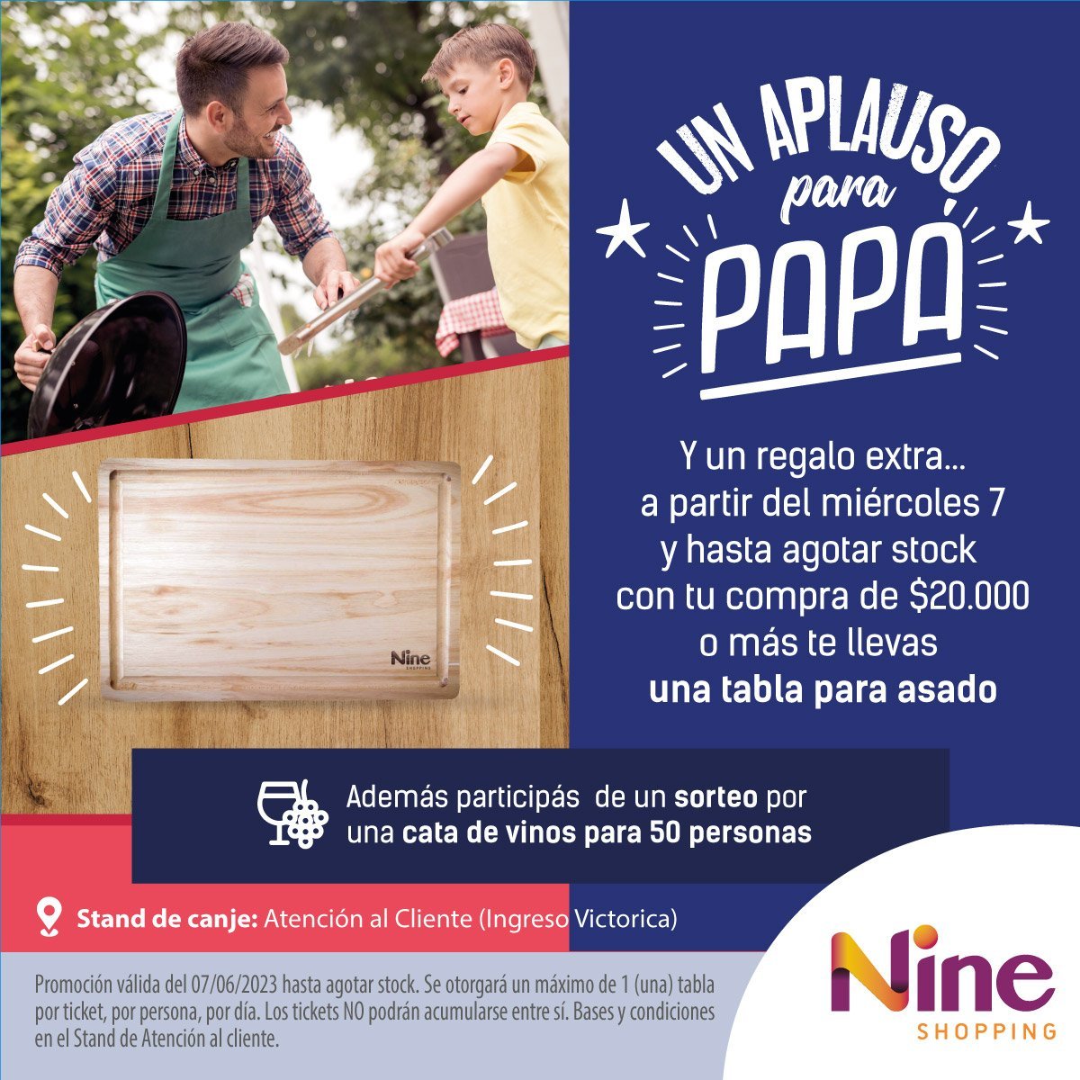 Por otro lado, Nine Shopping, ubicado en Av. Victorica 1128 (Moreno), anunció que a partir del miércoles 7 de junio y hasta agotar stock, con la compra de $20.000 o más, regalará una tabla para asado. Además, participarán de un sorteo para asistir a una cata de vinos para 50 personas. El obsequio se podrá obtener, presentando el ticket en el stand de atención al cliente (Ingreso Victorica), de lunes a viernes de 12 a 21 horas, y sábado y domingo de 10 a 21 horas.