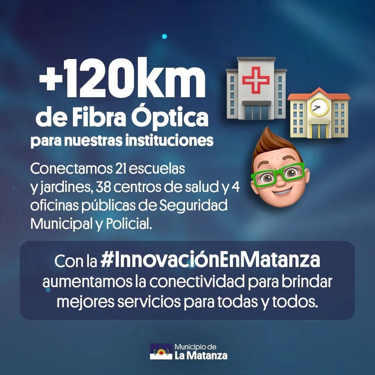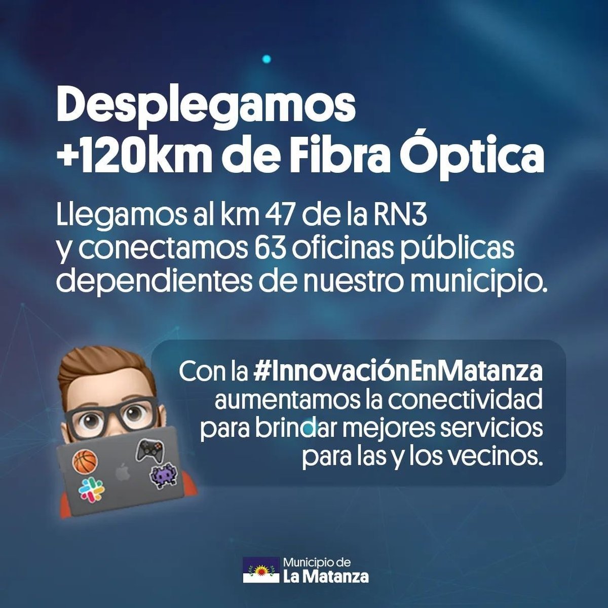 "Innovación en Matanza" es una iniciativa de la Secretaría General de Coordinación de Gestión e Innovación, que permite que en la actualidad se hayan desplegado más de 120 kilómetros de fibra óptica que llegan hasta el Km. 47 de la Ruta Nacional 3, conectando 63 oficinas públicas dependientes del Municipio de La Matanza.