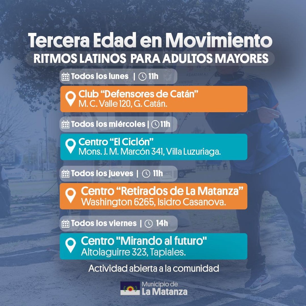 "¡Tercera edad en movimiento! Vení a divertirte y moverte junto a nosotros, ¡Te esperamos!", anunciaron a través de las redes sociales. Y continuaron: "Estamos realizando clases de Tai Chi y Ritmos Latinos orientadas a nuestras y nuestros adultos mayores con el objetivo de fomentar una vida saludable y acompañarlos en el ejercicio de sus capacidades cognitivas, físicas y emocionales". Además, destacaron que "todas las actividades son gratuitas y abiertas a la comunidad en distintos puntos de nuestro municipio".