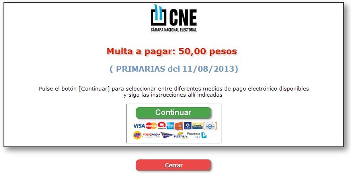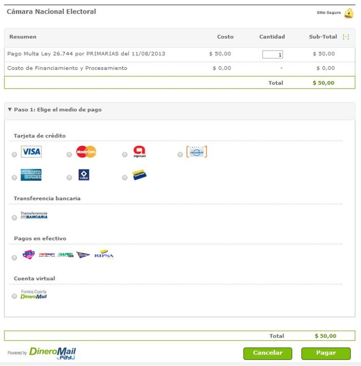 La penalización por no emitir el sufragio puede abonarse directamente en la web de la Cámara Nacional Electoral (CNE) con cualquier método de pago digital, o de forma presencial en alguna de las sedes del Banco de la Nación Argentina (BNA) en efectivo, con Mercado Pago o con transferencia bancaria.