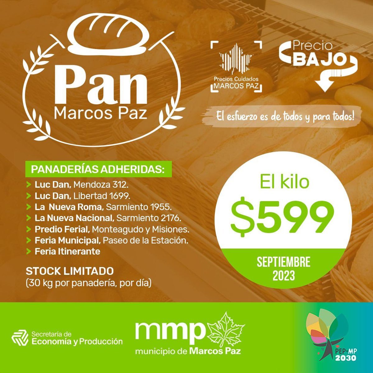 El Municipio de Marcos Paz continúa ofreciendo diferentes productos a precios justos, por lo que los vecinos del distrito y alrededores pueden adquirir una gran variedad de artículos de la canasta básica a un valor mucho más bajo que en cualquier otro lugar. En esta oportunidad, se puede acceder a un maple de huevos a un valor promocional de $1500 y el kilo de pan a $599, durante el mes de septiembre.