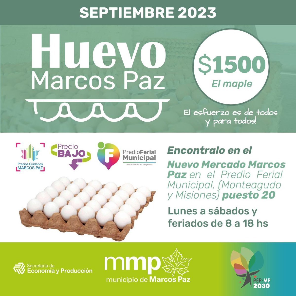 Mientras que el maple de huevos se podrá conseguir hasta agotar stock en el Nuevo Mercado Marcos Paz, ubicado en el Predio Ferial Municipal (Monteagudo y Misiones, en el Barrio del Prado), puesto 20, de lunes a sábados y feriados, de 8 a 18 horas.