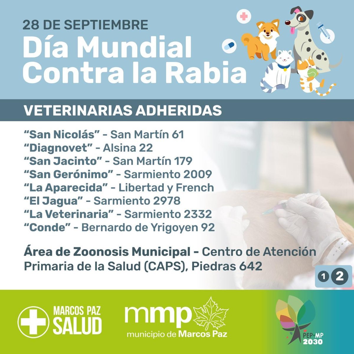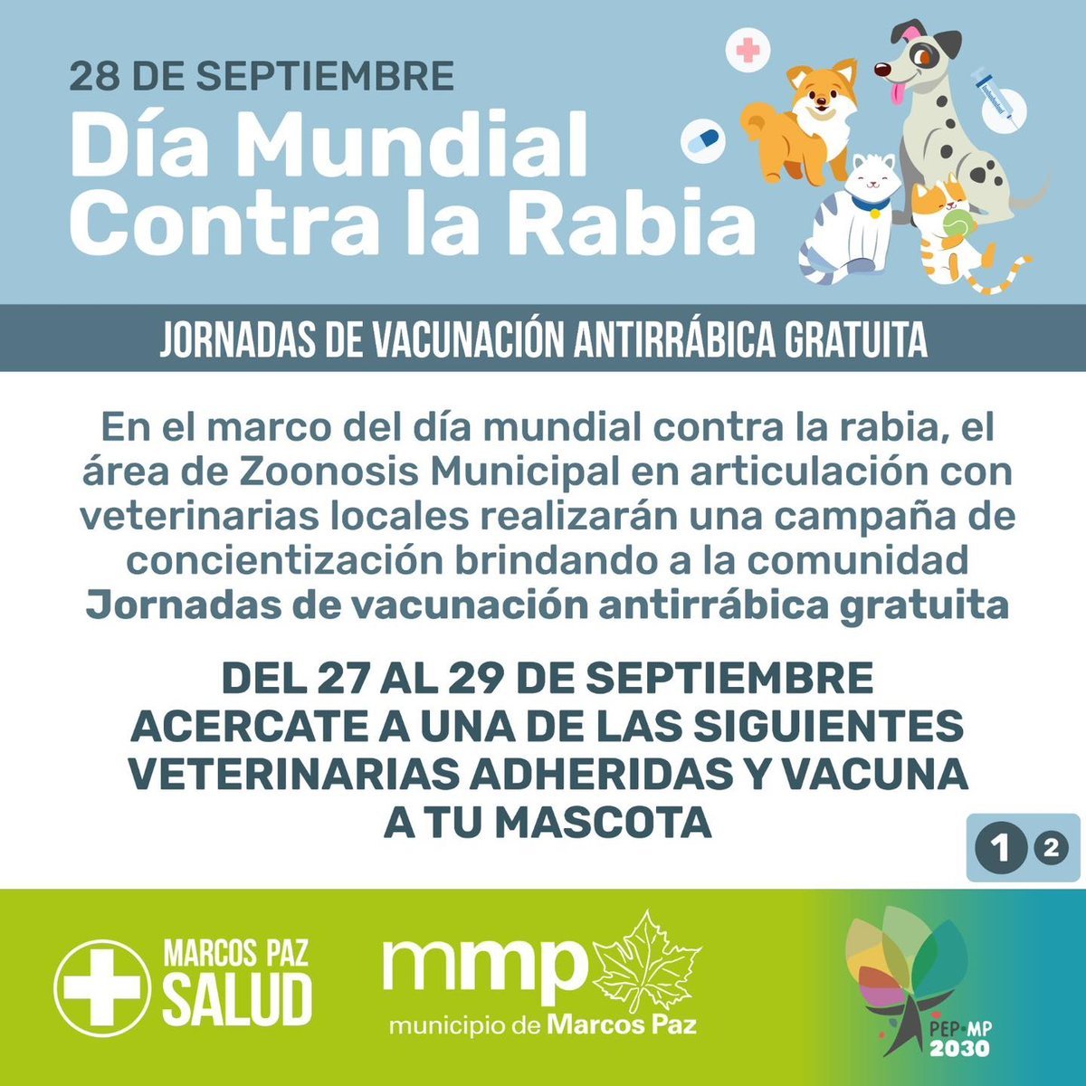 La Dirección de Zoonosis del Municipio de Marcos Paz llevará adelante Jornadas de vacunación a antirrábica gratuita, en el marco del Día Mundial contra la Rabia que se celebra el 28 de septiembre. La misma se desarrollará del 27 al 29 de septiembre en todas las veterinarias adheridas del distrito.