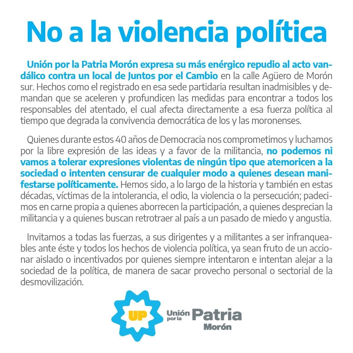 Bajo el título "No a la violencia política", desde el partido político Unión por la Patria expresaron "su más enérgico repudio al acto vandálico contra un local de Juntos por el Cambio en la calle Agüero de Morón sur. Hechos como el registrado en esa sede partidaria resultan inadmisibles y demandan que se aceleren y profundicen las medidas para encontrar a todos los responsables del atentado, el cual afecta directamente a esa fuerza política al tiempo que degrada la convivencia democrática de los y las moroneneses".