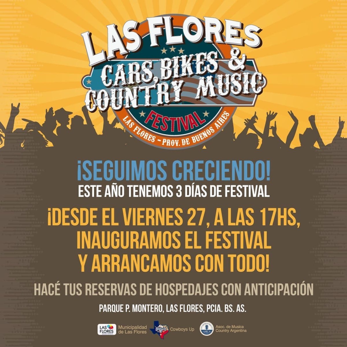 El viernes 27, sábado 28 y domingo 29 de octubre, la ciudad de Las Flores llevará adelante una nueva edición del festival de música country, conocido como "Cars, Bikes & Country Music", con entrada libre y gratuita. El mismo tendrá lugar a partir de las 17 horas, en el Parque Plaza Montero de la ciudad bonaerense de Las Flores.